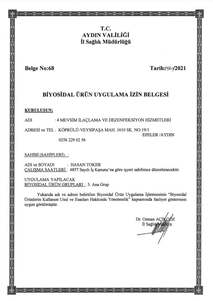 Aydın, Muğla, İzmir ve Manisa'da T.C. Sağlık Bakanlığı onaylı, garantili ve profesyonel ilaçlama ve dezenfeksiyon çözümleri.